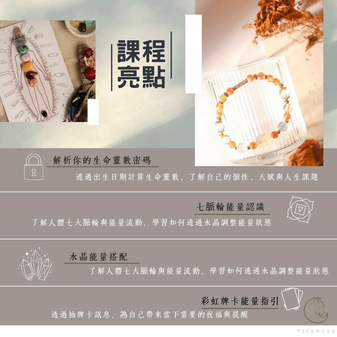 這堂課你將學習到 ✅簡易生命靈數計算 ✅流年寶石計算 ✅引導設計、綁線 ✅如何與水晶更好的合作 ✅能量水晶淨化方式